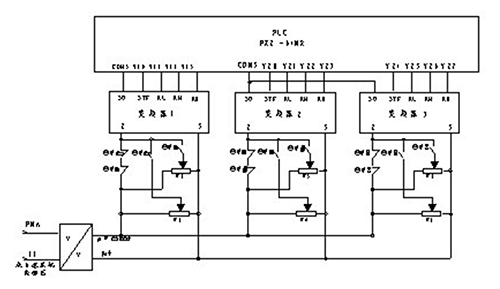 變頻器1﹑2﹑3分別控制電機(jī)M13﹑M14﹑M15,主回路接線圖略。PLC為FX2-64MR。FMA﹑11是來自灌裝機(jī)變頻器0~10V的輸出信號,經(jīng)過信號隔離器的轉(zhuǎn)換作為變頻器1﹑2﹑3的控制信號。圖中KA1-6為輔助繼電器。W1-6為分壓電位器。PLC的輸入端子略。FMA﹑11是來自灌裝機(jī)主機(jī)變頻器的輸出信號。兩圖中的PLC為同一PLC,圖2中的COM6接DC24V電壓,控制輔助繼電器。