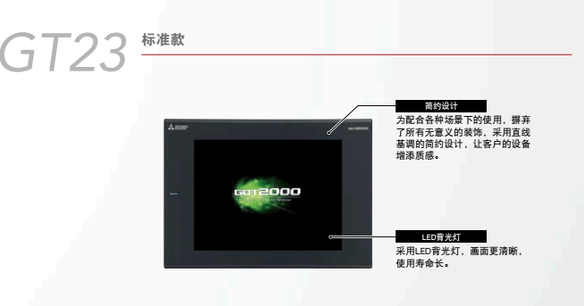 三菱觸摸屏GT23系列為三菱觸摸屏GOT2000系列旗下產品,是所有三菱觸摸屏中性價比最高的兩種型號之一,其功能強大,價格低廉,可選擇型號多。三菱觸摸屏GT23系列外形設計直線基調的簡約模式,摒棄了所有無意義的裝飾,與客戶的設備搭配起來顯得更有質感。