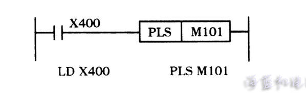 下圖為脈沖輸出梯形圖及指令。指令PLS 的作用是將脈沖寬度較寬的輸入信號