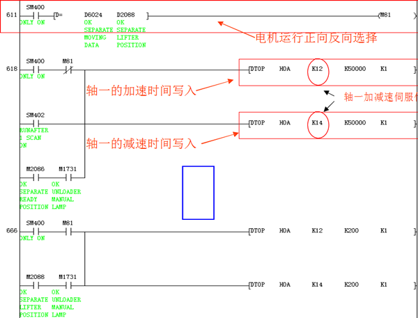 通過(guò)M81的接通和斷開,來(lái)選擇電機(jī)在正向運(yùn)行時(shí)的加減速,如果只通過(guò) 對(duì)伺服參數(shù)的直接設(shè)定,那么電機(jī)的正向運(yùn)行和反向運(yùn)行時(shí)的加減速一樣。